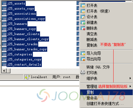 2、在上面第三步第3点中,全选本地数据库中的表,然后右击复制(注意不是复制表),或者ctrl+C复制所有表